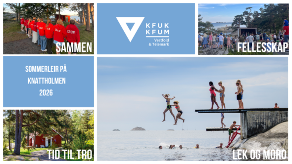 Leir på Knattholmen Leir på Knattholmen arrangert av KFUK-KFUM Vestfold og Telemark KNØTTENATT 2026 - fra 5 til 9 år 30. mai - 31. mai Les mer og meld deg på her SOMMERLEIR 2026 - Barn født 2011 - 2014 22. juni - 26. juni 2026 Les mer og meld deg på her SOMMERLEIR 2026 - Ungdom født 2007 - 2010 27. juni - 30. juni 2026 Les mer og meld deg på her SOMMERLEIR FOR GODT VOKSNE 2026 30. JUNI - 5. JULI 2026 Les mer og meld deg på her KM-CAMPEN - 2024 / Familiecamping 27. juni - 19. juli FERIA FOR ALLE 1 - 2026 - Familieleir 6. juli - 12. juli Les mer og meld deg på her FERIE FOR ALLE 2 - 2026 - Familieleier 13. juli - 19. juli Les mer og meld deg på her SOMMERLEIR 2026 - Barn 2014 - 2017 3. august - 7. august Les mer og meld deg på her KNATHOLMEN-DAGEN 2026 30.08.2026
